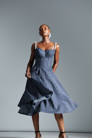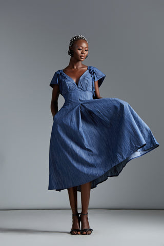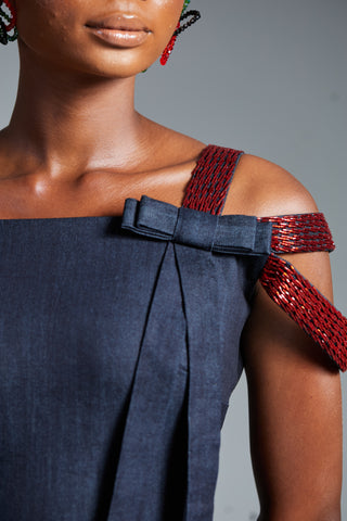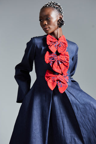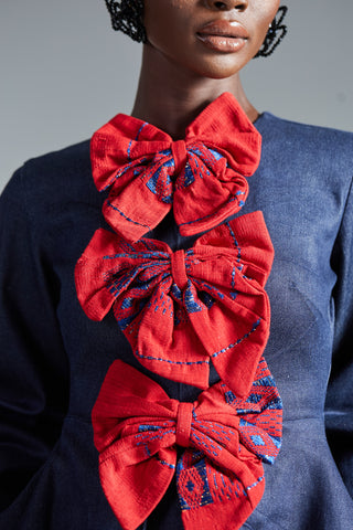 Made from 100% soft denim, this flirty mini features three striking *aso-oke* bows in vibrant red with shimmering blue threads, adding a touch of Nigerian heritage.