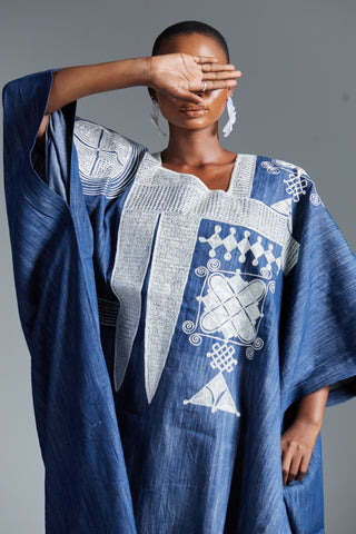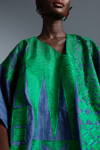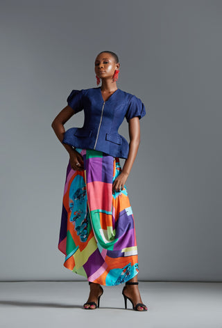 the global appeal and versatility of denim while highlighting the elegance of Nigerian heritage textiles.